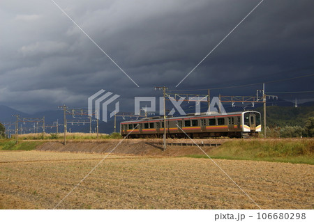 雨雲と秋晴れの境目と上越線E129系電車(新潟県南魚沼市)