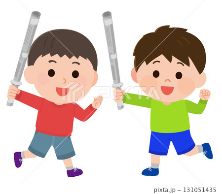 新聞紙で作った剣でチャンバラをする男の子たち イラスト