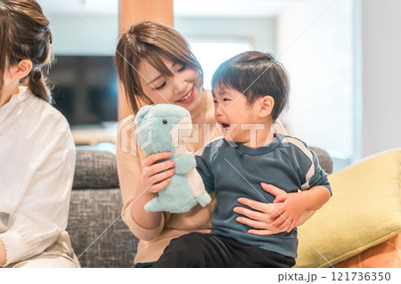 イヤイヤ期の男の子をぬいぐるみであやす母親・親子・ママ友・子供
