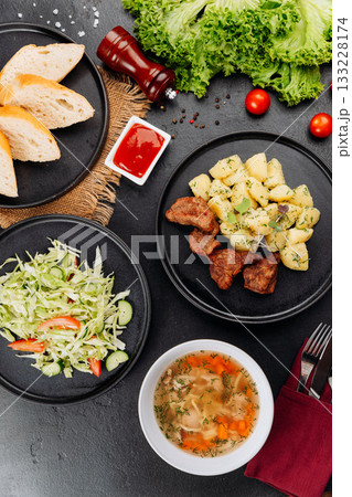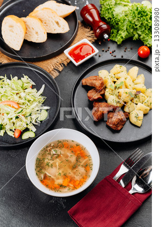 Hearty restaurant lunch: soup, fried meat with potatoes, fresh cabbage salad and bread