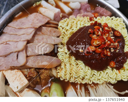 A Korean-style spicy noodle hot pot topped with gochujang chili paste, sliced meat, tofu, and vegetables, representing homemade street food and restaurant-style Korean cuisine