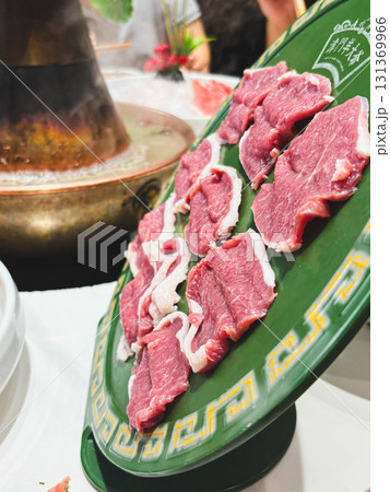 aw, fresh, high-quality red meat sits on a Chinese plate, standing upright on the table. Slices of raw meat before cooking.