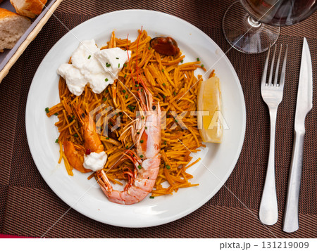Pasta with seafood contains tiger prawns, shell mussels, spices and white sauce