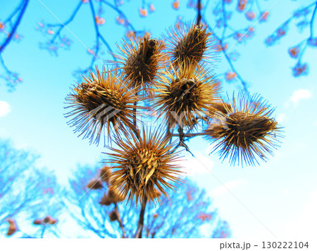Arctium lappa, dried lesser burdock. A spring meadow with dried burdock flowers, commonly called greater burdock, edible burdock, lappa, or beggar's buttons.