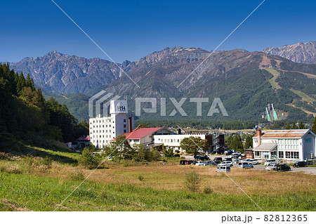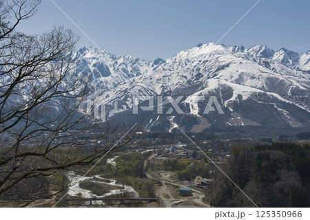 野平から見る残雪の白馬連峰と八方尾根スキー場 長野県白馬村