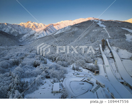 朝日に輝く五竜岳と唐松岳とジャンプ台 長野県白馬村(ドローンによる空撮)