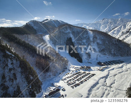 白馬連峰と八方尾根スキー場の雄大眺め 長野県白馬村(ドローンによる空撮)
