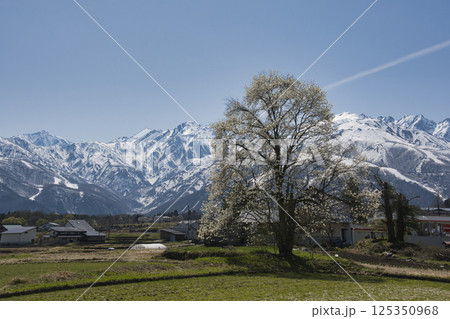 満開のコブシと残雪の白馬連峰 長野県白馬村