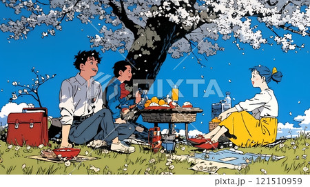 満開の桜の下で仲間たちと花見宴会