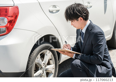 チェック表を使って車の査定・見積もりをするセールスマン・査定士男性スタッフ