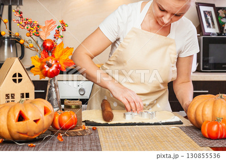 A woman cuts out cookies for Halloween with a mold in the kitchen with an autumn decor.