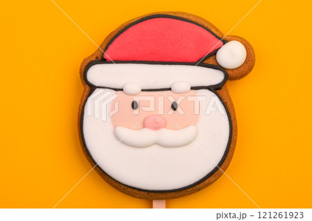 Decorated Christmas cookie shaped like hot chocolate mug closeup.