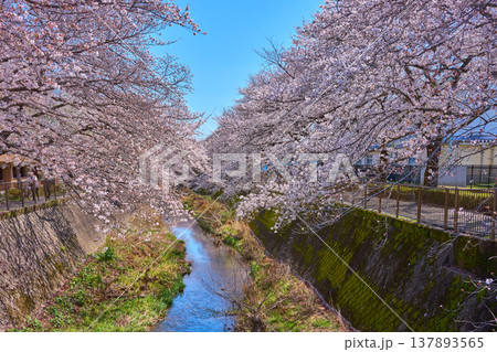 春の東京都稲城市の三沢川さくら回廊を堺橋付近から見る