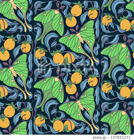 Art Nouveau seamless pattern with Luna moths and ripe persimmons. Symmetrical organic design with elegant curves