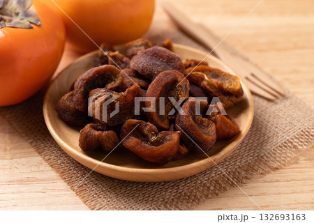 Dried persimmon on wooden plate ready to eating, Sweet and chewy