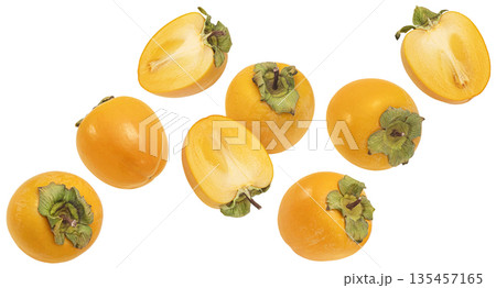 Falling kaki fruits isolated on white background with clipping path, full depth of field