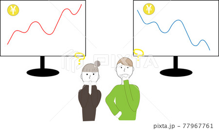 株価の暴騰と暴落の画像をみて悩む男女