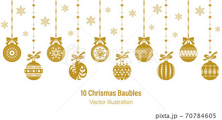 吊り下げされた10種類のクリスマスオーナメント、白背景