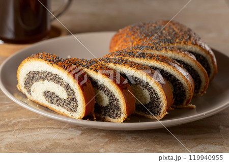 Poppy seed roll slices and black coffee.