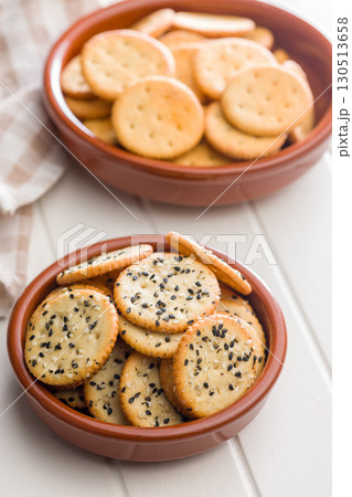 Crispy round salted crackers in bowl on white table.