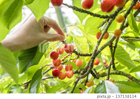 さくらんぼ狩りを楽しむ女の子の手。北海道余市町の観光果樹園でさくらんぼ狩りをしたよ。