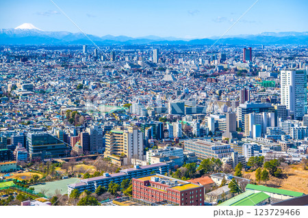 日本の東京都市景観 富士山が見える珍景・新風景。渋谷のビル群や池袋、電車などを望む。アクシュ、男体山