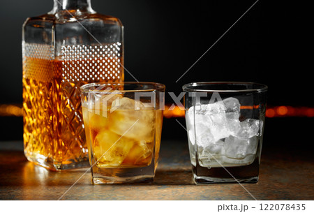 Whiskey with ice on a dark background.