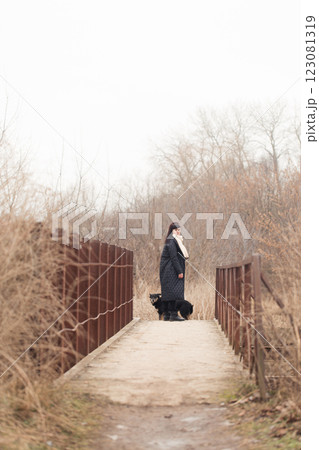 Woman and her dogs on an rusty bridge
