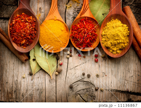 Spices and herbs. Curry, saffron, turmeric, cinnamon over wood