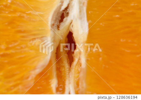 Detailed close-up photo of juicy orange slices. Citrus fruit macro photo