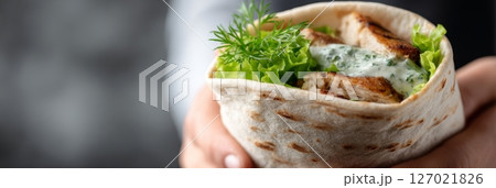 Hands grasp a delicious wrap filled with grilled chicken and fresh herbs, perfect for eating on the go