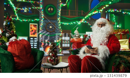 Portrait of joyous Santa Claus reading letters from kids on smartphone, surrounded by holiday props. Upbeat octogenarian man reading children Christmas wish lists on mobile phone, camera A