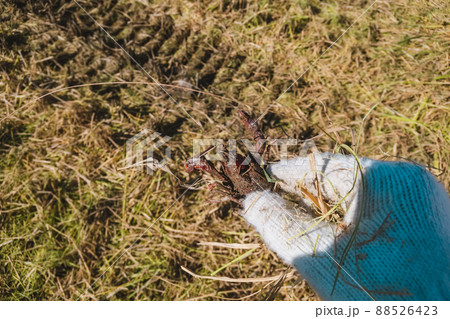 田植えをする子供にザリガニを渡す