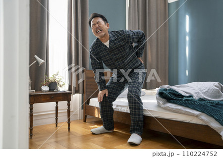 パジャマ姿の中高年男性 腰痛・ぎっくり腰 イメージ