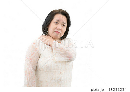 室内に立っている、腰痛、肩こりに悩んでいるカジュアルウェアー姿の中年女性