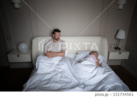 Angry couple in conflict, woman turned away from man in bed after argument. Failed intimacy attempt