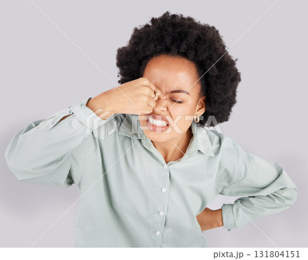 Headache, stress and face of frustrated black woman in studio with upset, angry and pain facial expression. Burnout, mockup and girl on white background with confused gesture, migraine and thinking