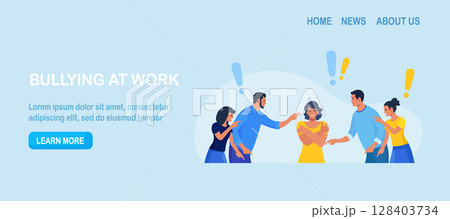 Group of violent people bullying, accusing coworker. Employees point fingers and laugh. Toxic work, abuse, bullying colleagues. Exhausted depressed employee. Angry furious characters yelling at woman