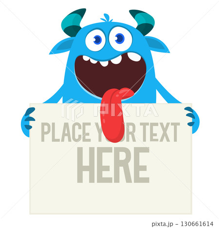 Catoon funny monster character holds banner paper sign for advertisement. Halloween illustration