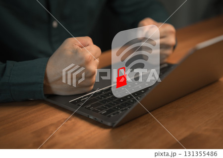 Frustrated person with fists clenched in front of laptop showing locked Wi-Fi icon, representing internet connection problems, network security and online access restrictions.