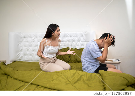 Indonesian southeast asian couple have an argument in the bedroom. Having a crisis and difficulties in a relationship