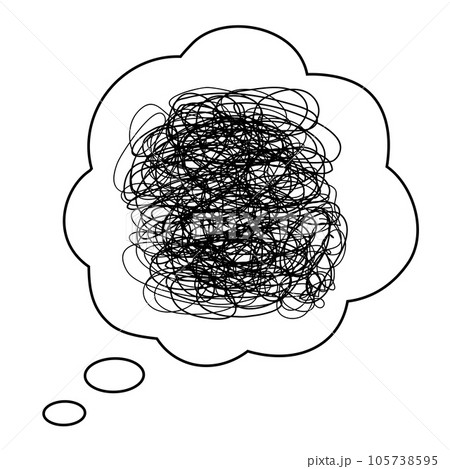 ぐちゃぐちゃに絡まった線の吹き出し。モヤモヤ、イライラ、ストレス、憂鬱、頭痛、悩みを表すアイコン。
