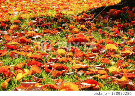 晩夏の青い花と秋色の背景|柔らかな光に包まれた自然のマクロ写真