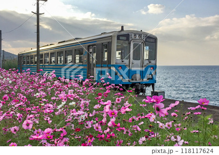 愛媛・伊予市 JR下灘駅に到着する電車とコスモス