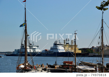 フィンランド ヘルシンキ カタヤノッカ に停泊するヨットや複数の砕氷船