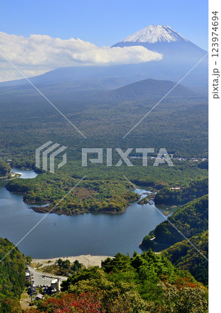 御坂山地の精進峠付近より望む紅葉の富士山と精進湖のパノラマ