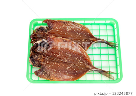 鯖の醤油干し、干物ザル入り【白背景・切り抜き】