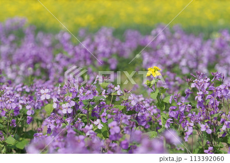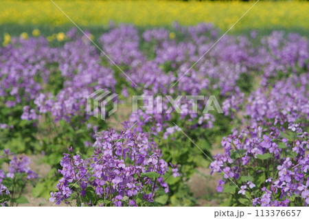 ムラサキハナナの花畑の菜の花