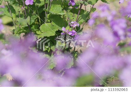 ムラサキハナナにとまったアゲハ蝶