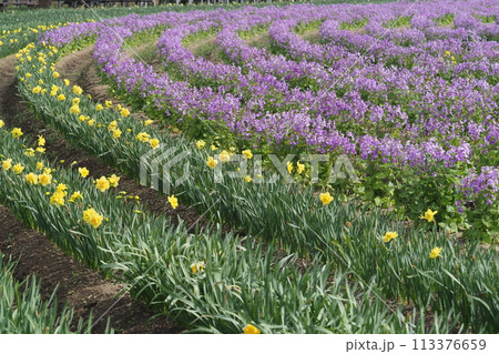 ラッパ水仙とムラサキハナナの花畑